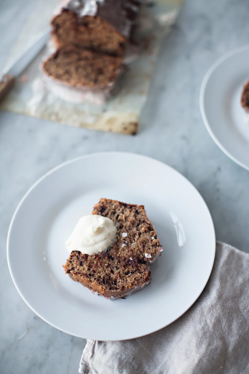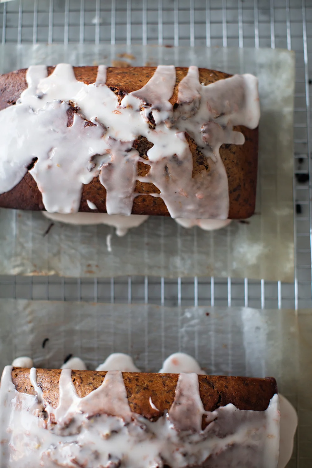 While the cake bakes, prepare the glaze. In a bowl, combine the remaining ½ tbsp grapefruit zest with the remaining ¼ cup / 60 ml grapefruit juice. Gently, in order to prevent a confectioners’ sugar snowstorm, stir in the confectioners’ sugar and continue to stir until well mixed.