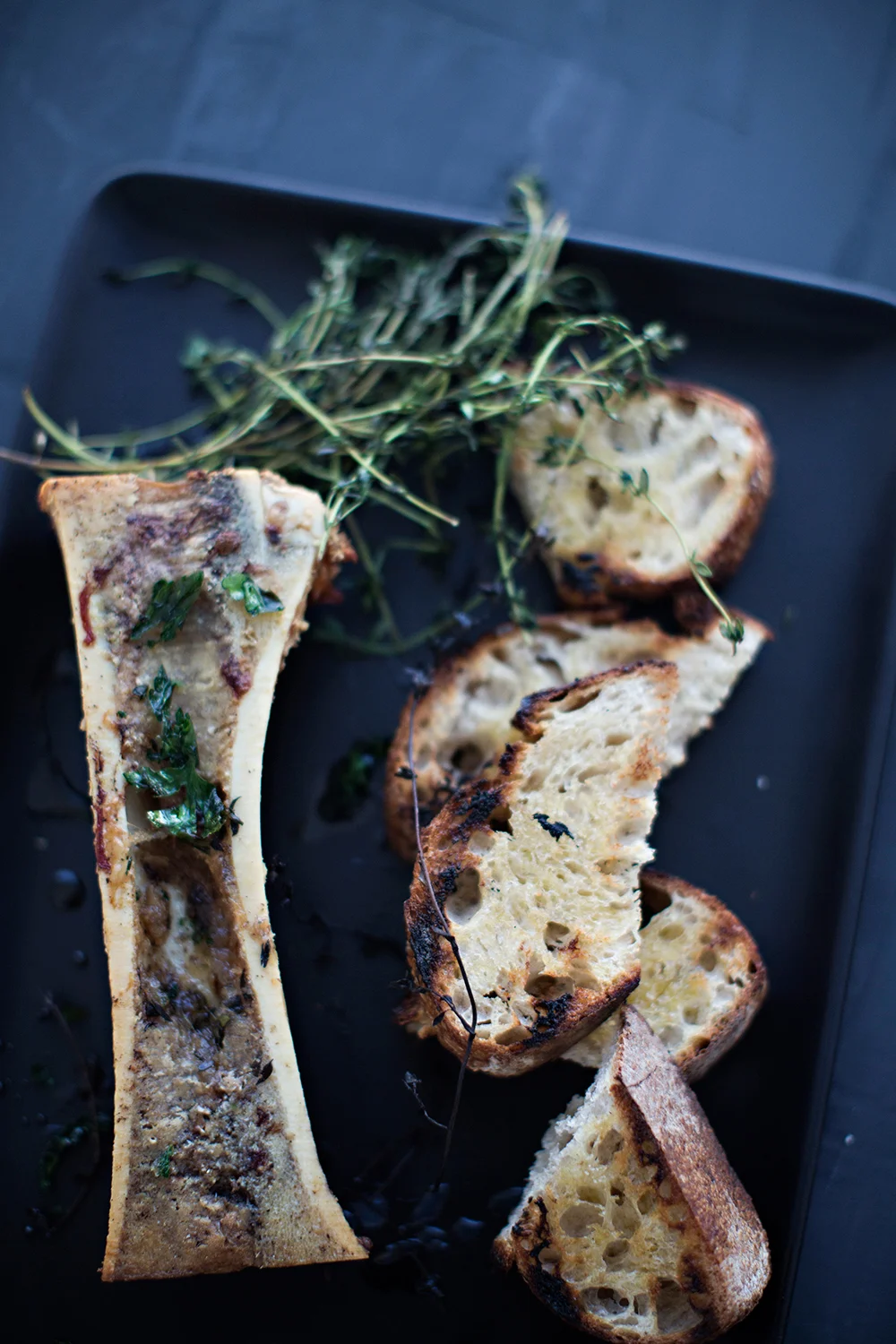 To serve, arrange the slices of bread alongside bone on a family style platter. Garnish with parsley and thyme. Scoop out the marrow and spread it on toast and top with sea salt and more parsley.